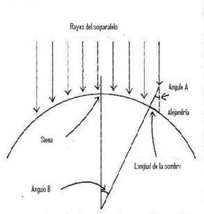 Si dos líneas paralelas son cortadas por una tercera, los ángulos internos son iguales. Por tanto los ángulos A y B son iguales; es decir la distancia entre Alejandría y Siena es de 7ª (grados) y 800 Kms. como ya sabíamos.